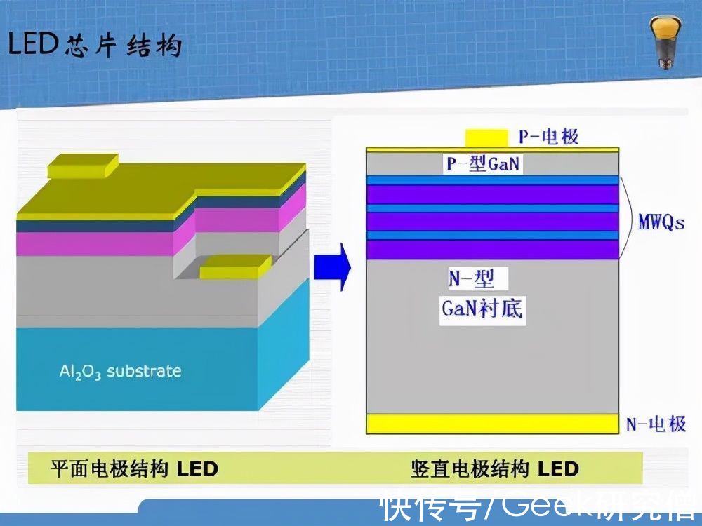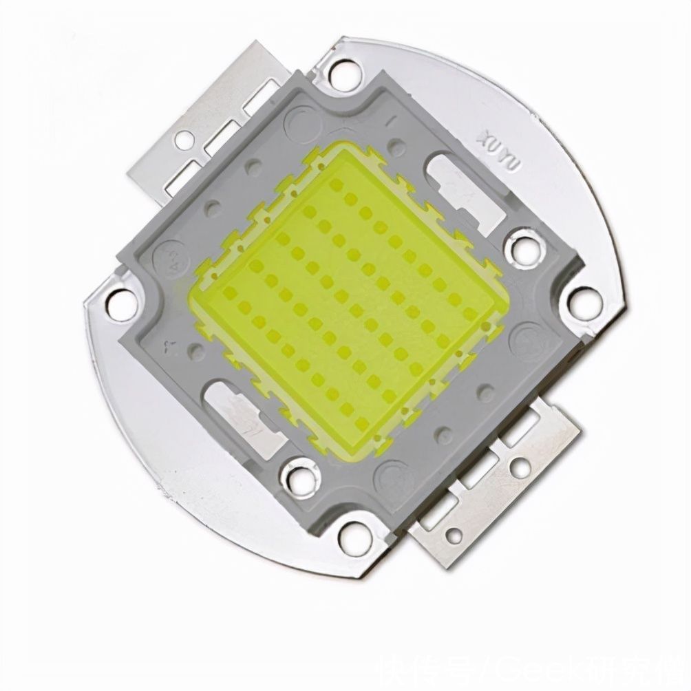 我们常见的 LED(发光二极管)就是利用电致发光原理制成,它的外层有两个电极,内部核心就是灯珠中心那颗芝麻大小的晶片,这个晶片又被分为好几层:最上层叫做 P 型半导体层、中间层为发光层、最下层叫做 N 型半导体层。