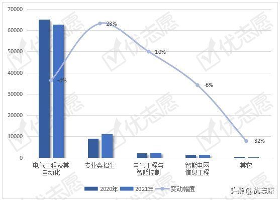 2021年全国电气类专业招生计划数接近8万人,较去年下降0.4%。电气工程与智能控制专业招生计划数上涨10%,该专业是电气、电子信息与控制相结合的宽口径专业,2021年有多所本科院校新增了电气工程与智能控制专业,其中包含合肥工业大学(211)。