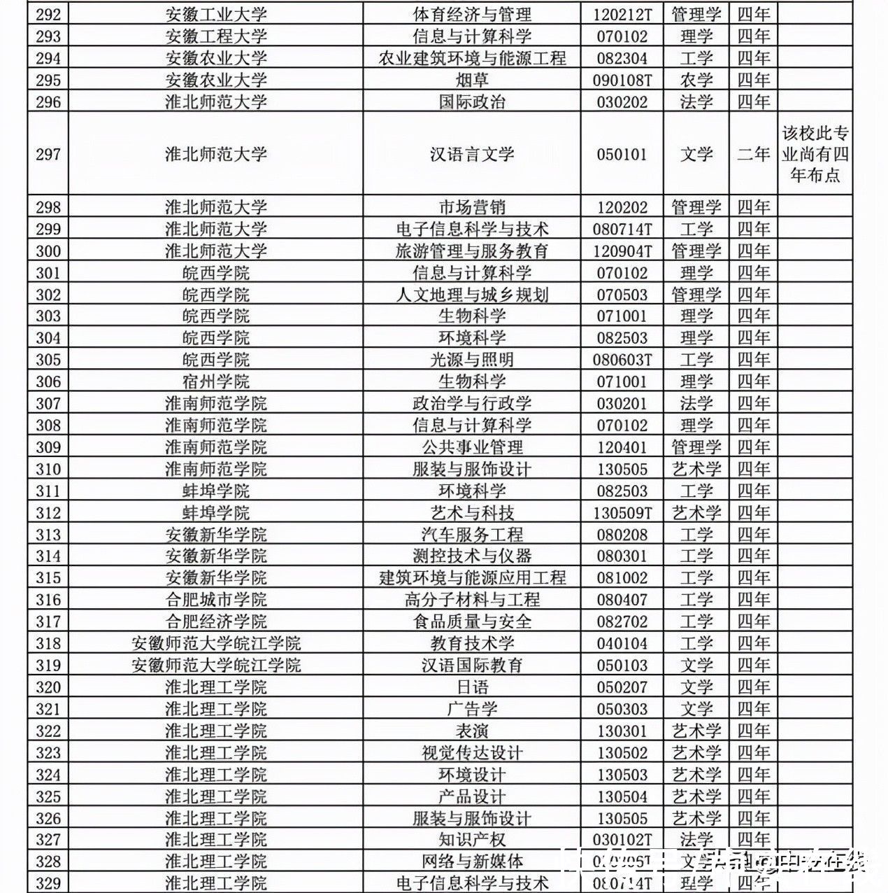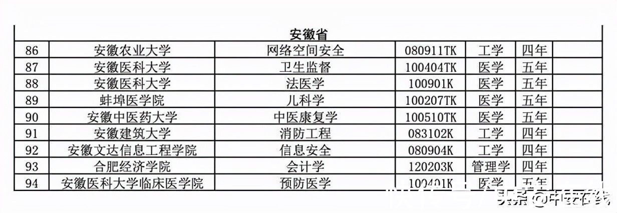 此外,在新发布的《新增审批本科专业名单》中,我省共有8所高校的9个专业“上榜”。其中包括,安徽农业大学的网络空间安全专业、安徽医科大学的卫生监督专业及法医学专业、蚌埠医学院的儿科学专业等。