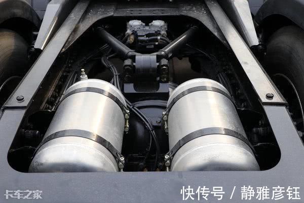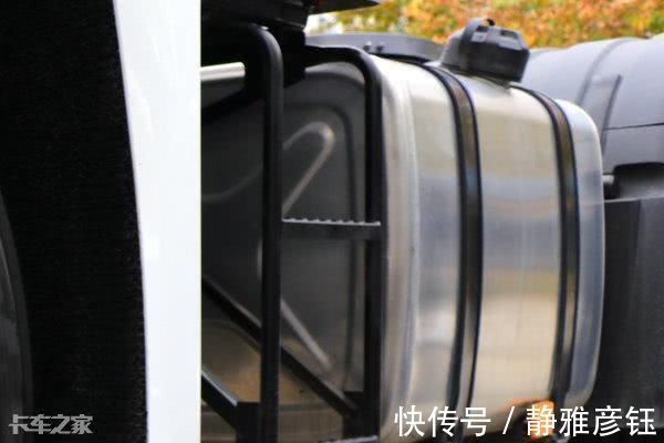 前轮后方为一个容量400升的铝合金油箱,而且这个油箱也是全车唯一一个油箱,其实这并不是厂家舍不得为车辆配备更大油箱,而是受限于法规,危化品运输牵引车油箱最大只能有400L。