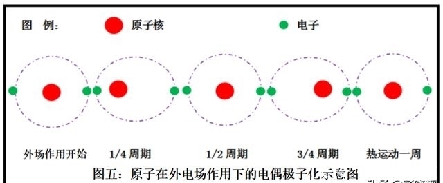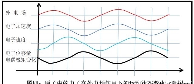 3.2.1、单个原子的强迫发光:当外加电场和磁场使原子中的电子和原子核朝相反的方向改变运动状态时,就会使原子成为与入射光主频相近的时变电偶极矩的电偶极子。原子就会产生与入射光主频相近的次生光,其中朝入射光反向传递的就被称作反射和散射光;朝入射光同向传递的就被称作折射、衍射和绕射光。但原子产生的次生光的相位与入射光是存在半个周期的差异的。因为自入射光加速电子(原子核因质量远大于电子,其位移量小得多,可暂不考虑),到电子的位移量达到最大值(最大电偶极矩)正好需要半个周期的时间。而次生光的相位与原子的电偶极矩是相同的。因此,次生光与入射光就出现了半个周期的相位差。如下图所示: